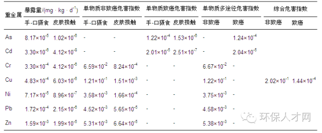 基于健康風險評價模型及相關參數指標,利用污泥中重金屬檢測結果對污泥的重金屬健康風險進行評價,兒童健康風險評價結果與成人健康風險評價結果分別如表 9和表 10所示.對于目標暴露人群為兒童,以手-口攝食為暴露途徑時,單一物質非致癌危害指數高的元素是Cu,危害指數為1.21×10-1;以皮膚接觸為暴露途徑時,單一物質非致癌危害指數高的元素同樣是Cu,其危害指數為1.51×10-3,各重金屬對非致癌風險貢獻率從高到低的順序是Cu > Cr >Zn> Pb > Ni.污泥重金屬非致癌綜合危害指數為2.02×10-1,致癌綜合危害指數為1.44×10-4,其中,以手-口攝食為暴露途徑時,其非致癌與致癌風險分別是2.00×10-1和1.42×10-4,以皮膚接觸為暴露途徑時,其非致癌與致癌風險分別是2.62×10-3和1.78×10-6,手-口攝食暴露途徑為主要的暴露途徑.本次污泥金屬健康風險評價研究中,非致癌綜合危害指數為1.09×10-1,并未達到非致癌風險警戒值“1”,對于兒童來說并不存在非致癌風險;污泥重金屬致癌綜合危害指數為1.44×10-4,超出USEPA提供的可接受區間(1×10-4 ~ 1×10-6),存在一定的致癌風險.但需要指出的是,為了揭示大的致癌風險值,該研究是假設長期生活在布滿污泥的環境中,因此,實際生活中,可能并不存在致癌風險.