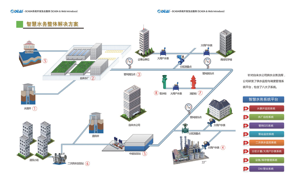 德艾智慧水務系統(tǒng)是本公司完全自主研發(fā),基于華通水務調(diào)度系統(tǒng)的既有平臺,通過標準化的建模和編碼規(guī)范,采用云計算、物聯(lián)網(wǎng)、大數(shù)據(jù)等先進技術,實現(xiàn)了將現(xiàn)有信息系統(tǒng)的整合和統(tǒng)一管理,打破了傳統(tǒng)業(yè)務功能子系統(tǒng)獨立建設、獨立運行的格局,構建成一個統(tǒng)一的平臺,將過去局限性信息傳遞至整個集團公司,將標準化和信息安全作為系統(tǒng)建設和互聯(lián)互通的基石。