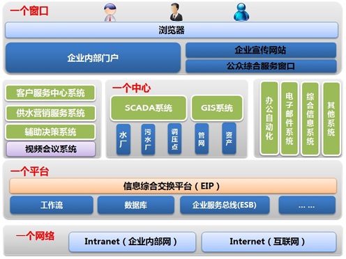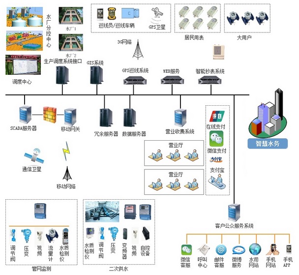 該系統(tǒng)是一種以基于物聯(lián)網(wǎng)的一體化綜合管理信息平臺為核心,結合數(shù)學仿真模型建立計算機智慧輔助決策的智慧管理系統(tǒng),系統(tǒng)涵蓋云計算數(shù)據(jù)中心、水質檢測、指揮排澇、污水處理、自來水生產(chǎn)調(diào)度管理、水務智慧安防和水務運營等功能。系統(tǒng)包含:GIS系統(tǒng)、GPS巡檢系統(tǒng)、SCADA系統(tǒng)、視頻監(jiān)控系統(tǒng)、客戶服務管理系統(tǒng)、網(wǎng)上營業(yè)廳系統(tǒng)等系統(tǒng)。其中,基于物聯(lián)網(wǎng)技術的云計算水務數(shù)據(jù)中心分別于其他子系統(tǒng)緊密連接,從而消除了以往水務各個管理系統(tǒng)信息資源不能共享的弊端,降低了運行成本,實現(xiàn)了辦公自動化、數(shù)據(jù)一體化、流程整合化、策劃科學化,以精細、動態(tài)、智能的方式進行水務管理、服務、決策工作,使水務管理達到智慧狀態(tài)。